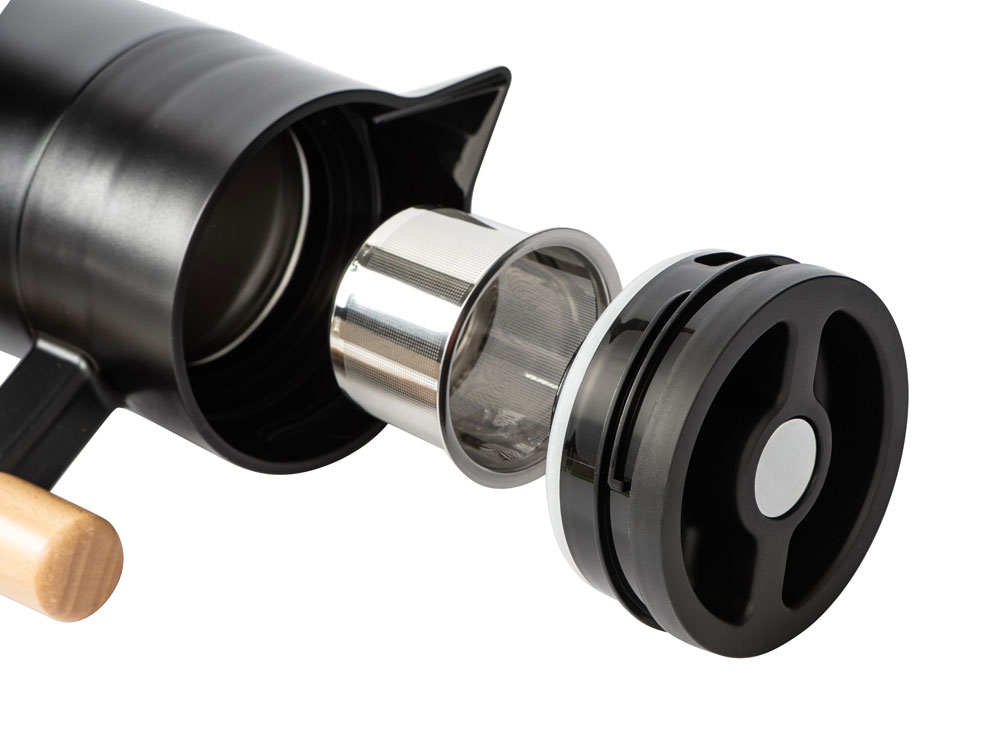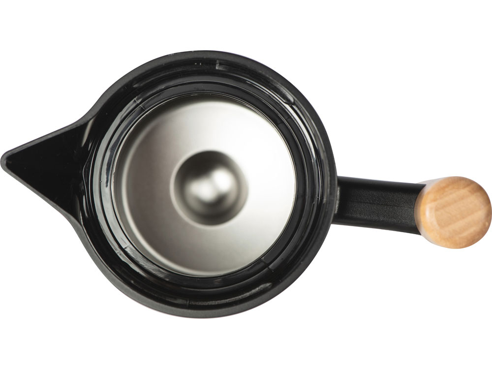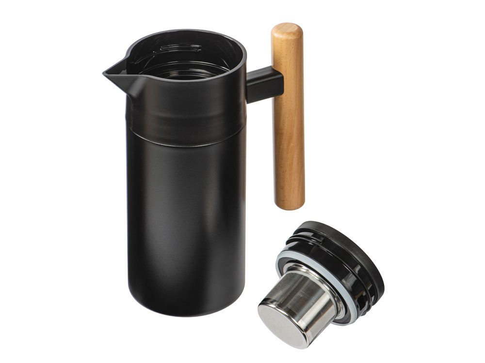 Вакуумный термокувшин черного цвета, подходит для чая и кофе. Сохраняет температуру в течение 24 часов благодаря двойным стенкам с вакуумной изоляцией. Съемное ситечко из нержавеющей стали можно мыть в посудомоечной машине, а деревянная ручка термопота делает его использование особенно удобным и безопасным. Объем термочайника — 1200 мл, этого хватит на 4 обычных чашки чая. Кофепот производится премиальным брендом Eat&bite Select — предметы этой марки отличаются лаконичным и продуманным дизайном, который легко впишется в любую кухню. - премиальный дизайн - подходит для чая и кофе - удобная деревянная ручка - вакуумная изоляция - съемное ситечко можно мыть в посудомойке - непроливайка