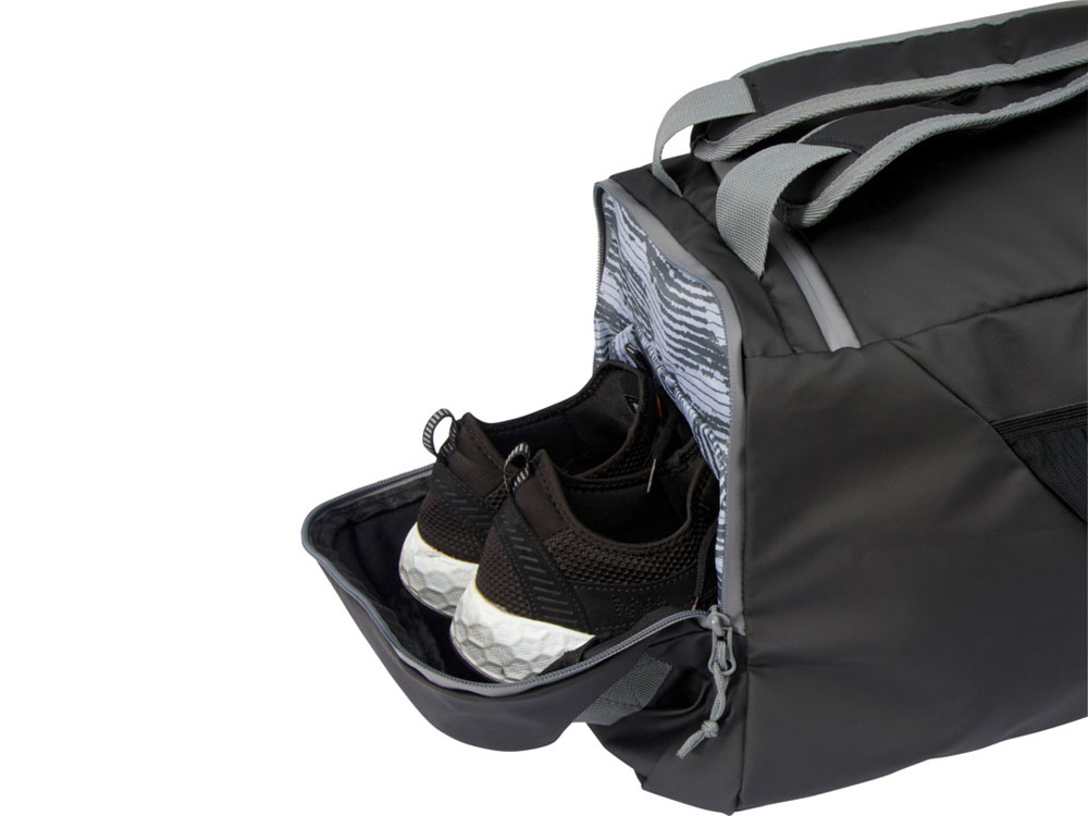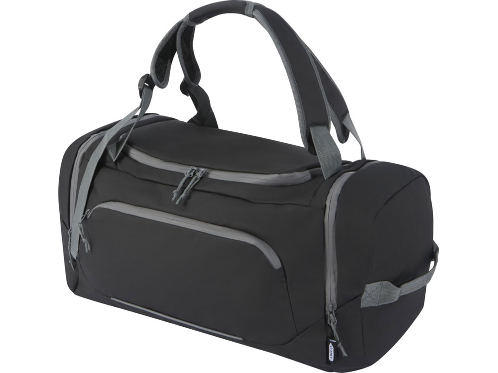 Водонепроницаемая спортивная сумка-рюкзак 2-в-1, изготовленная из переработанных материалов, сертифицированных согласно стандарту GRS, включая молнии. Имеет просторное основное отделение с U-образным отверстием для удобного хранения и доступа, два боковых кармана на молнии (включая отделение для обуви), один передний карман на молнии, сетчатый карман для бутылки с водой сзади и светоотражающую окантовку для видимости. Эту сумку можно носить 3 различными способами: в руке, через плечо или как рюкзак благодаря мягким регулируемым плечевым ремням. Из переработанных материалов, сертифицированных по стандарту GRS, изготовлены основная ткань, подкладка, лямки и застежки-молнии. Емкость: 35 литров. Не содержит ПВХ.