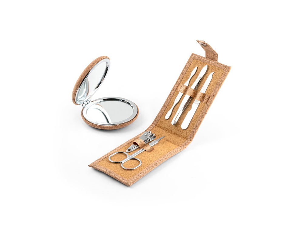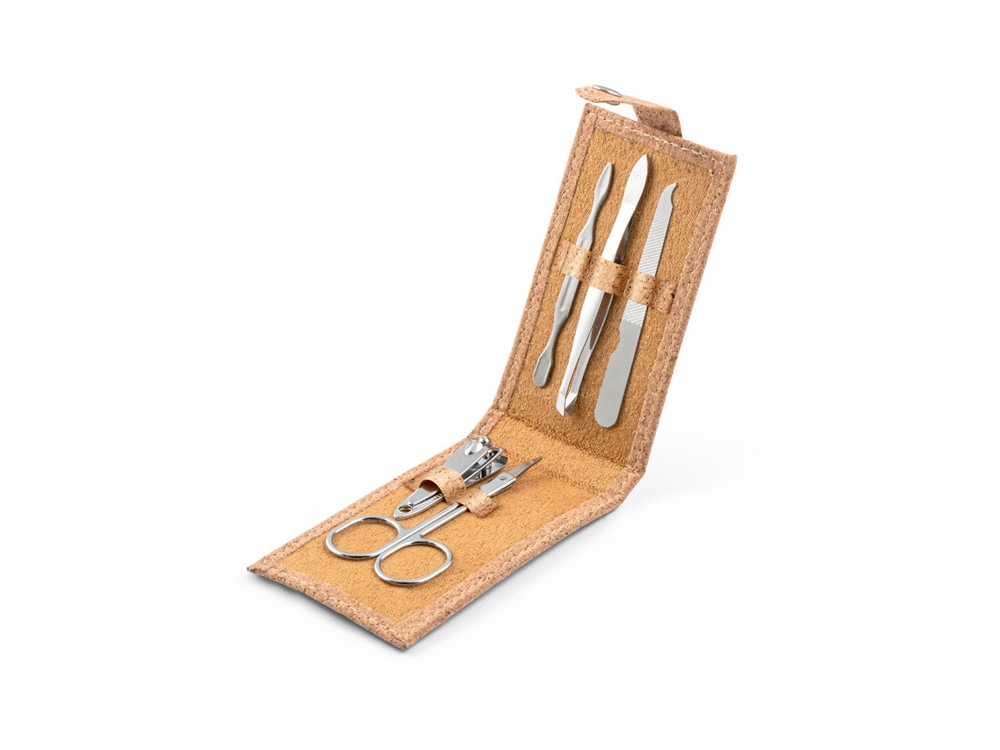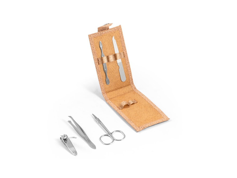 Набор для маникюра из пробки с 5 приборами из нержавеющей стали: пилкой, ножницами, кусачками для ногтей, пинцетом и толкателем для кутикулы. Поставляется в упаковке из натуральной бумаги. 104 x 61 x 17 мм