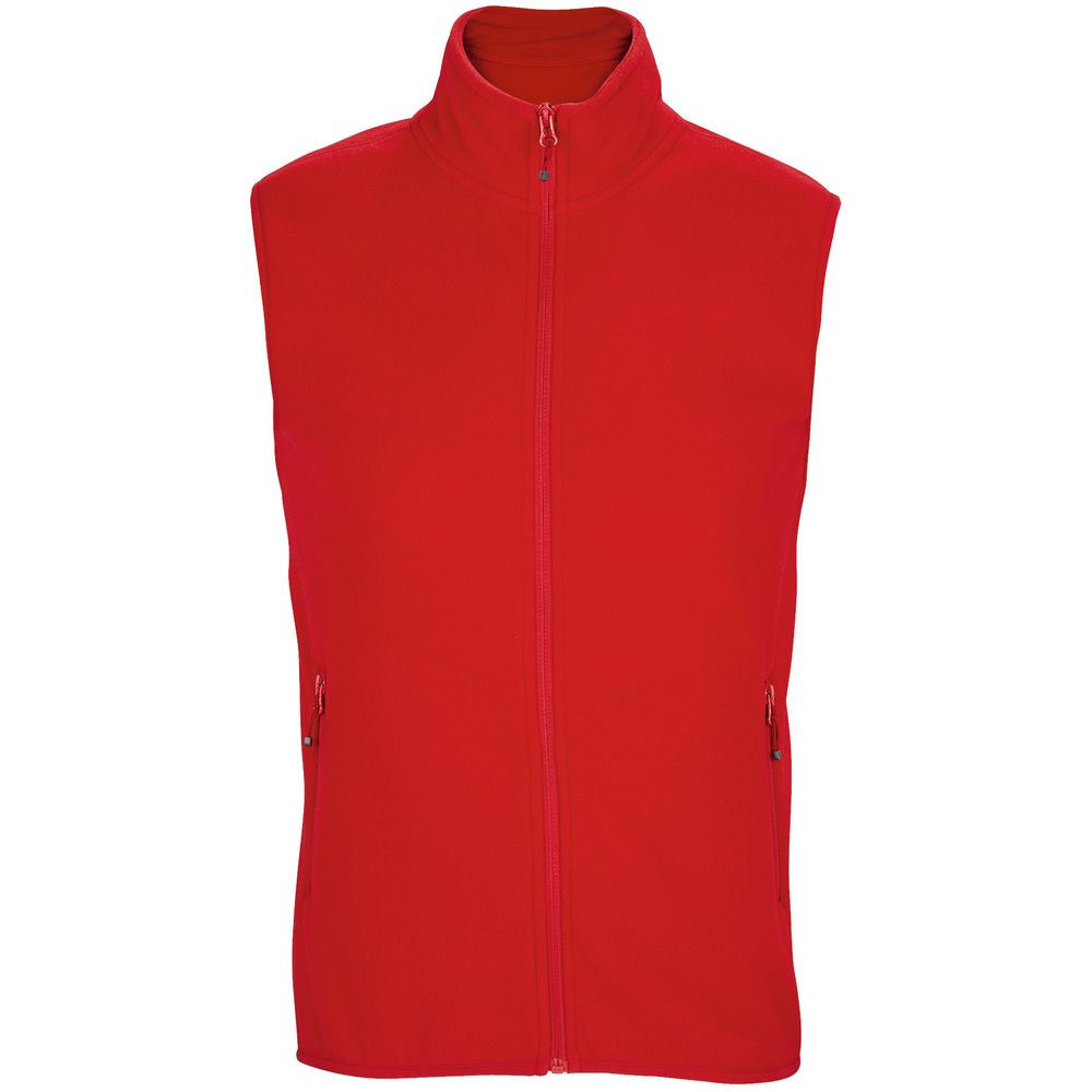 Флисовый жилет унисекс с воротником-стойкой. Застежка-молния в тон, боковые карманы на молнии. Укрепляющая тесьма по вороту. Отделка эластичной лентой по низу и проймам.