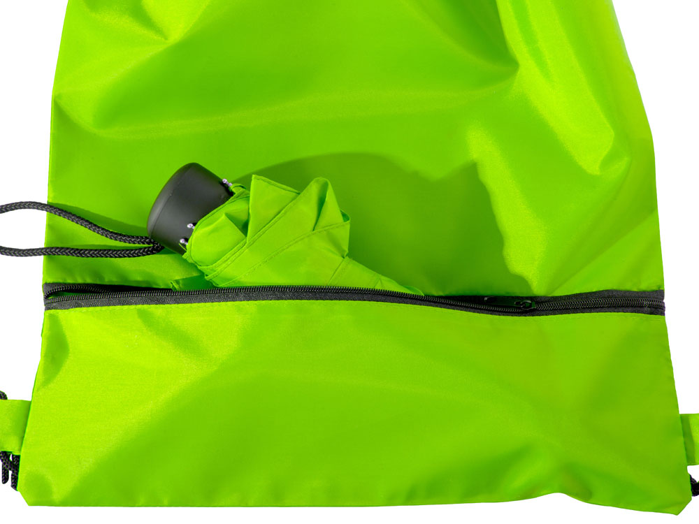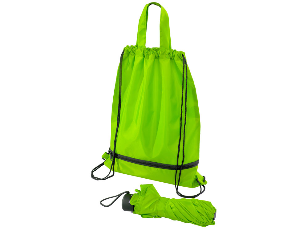 Механический зонт с прорезиненной ручкой идет в комплекте с сумочкой для покупок. На дне сумочки предусмотрен карман на молнии, в котором вы можете хранить зонт дома или прятать в него мокрый зонт, когда вы попали под дождь. Находясь в кармане сумочки, мокрый зонт не доставит неудобств. Сумочка имеет 2 варианта использования: шопер с двумя 2 ручками и рюкзак-мешок со шнурками.